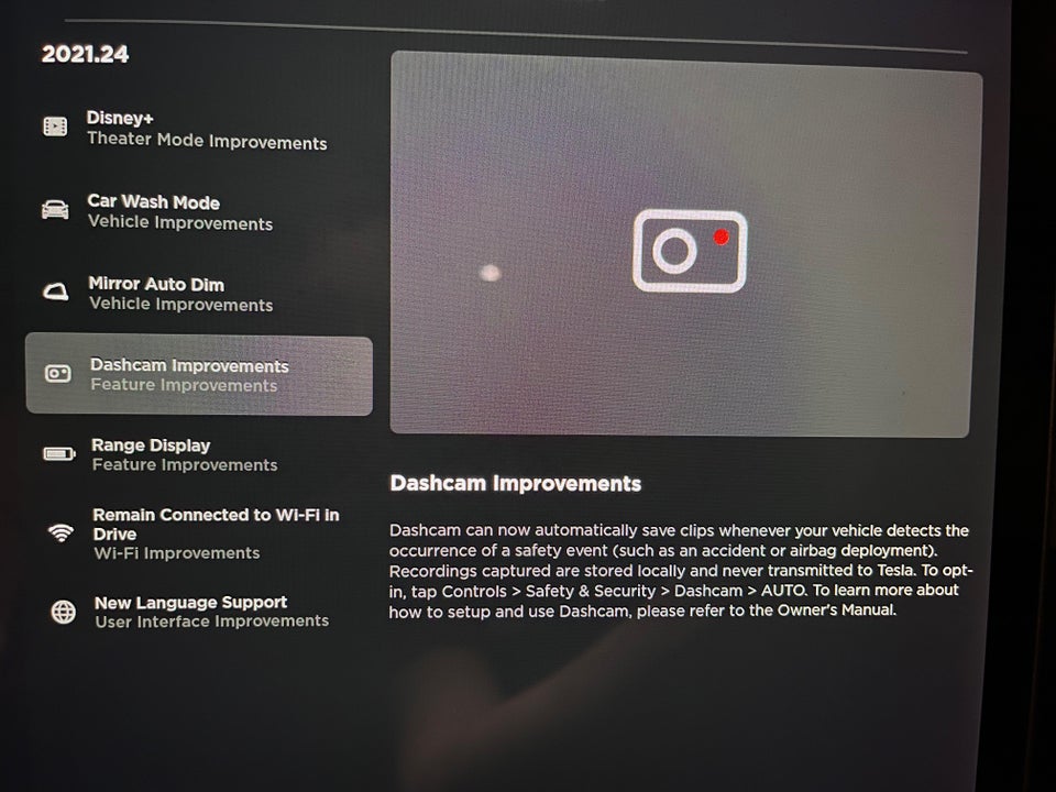 Dashcam can now automatically save clips whenever your vehicle detects the occurrence of a safety event (such as an accident or airbag deployment). Recordings captured are stored locally and never transmitted to Tesla. To opt-in, tap Controls > Safety & Security > Dashcam > AUTO. To learn more about how to setup and use Dashcam, please refer to the Owner’s Manual.