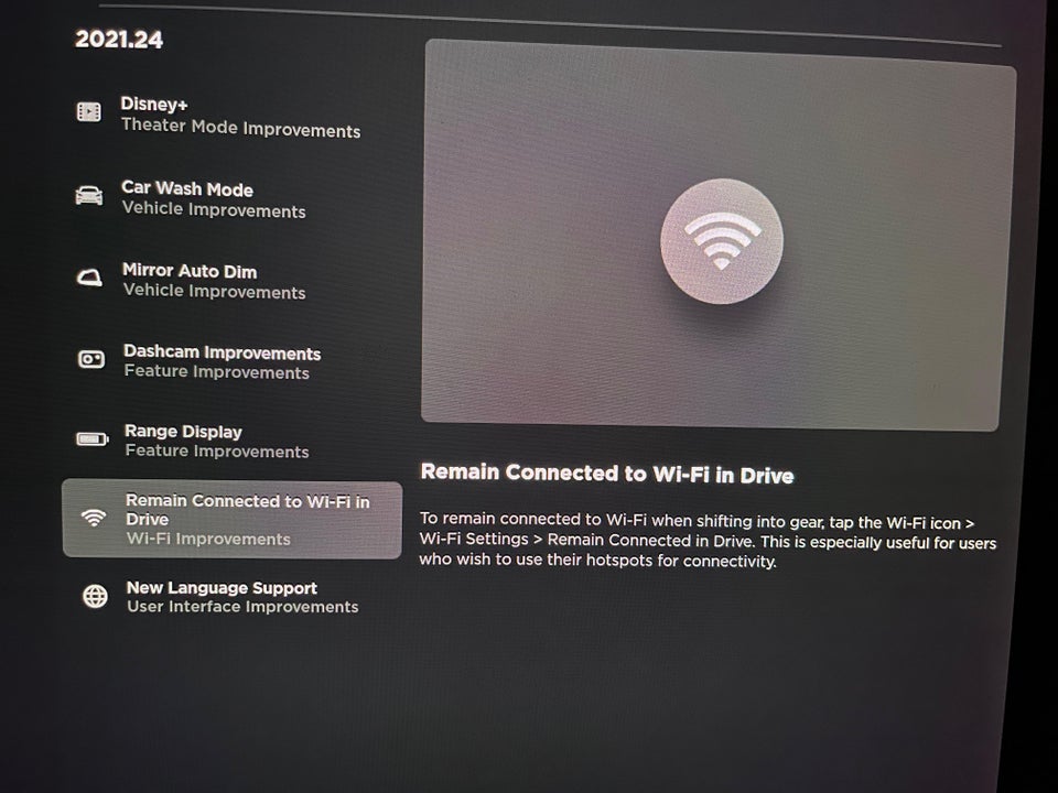To remain connected to Wi-Fi when shifting into gear, tap the Wi-Fi icon > Wi-Fi Setting > Remain Connected in Drive. This is especially useful for users who wish to use their hotspots for connectivity.